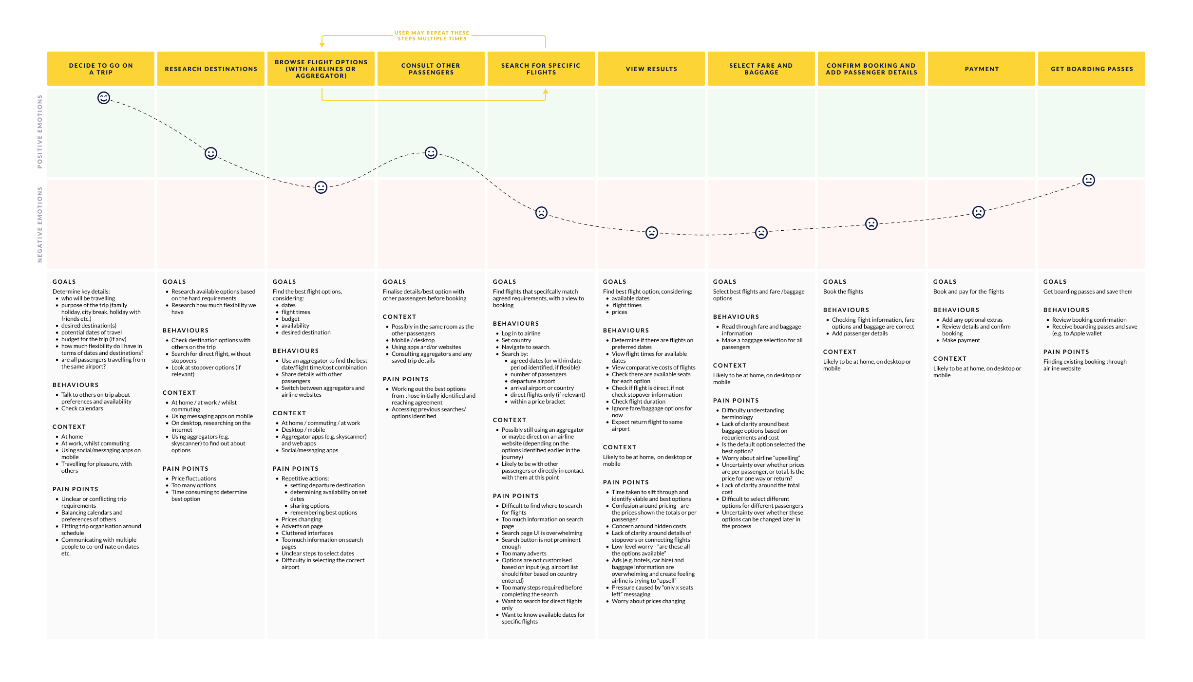 Visualised behaviours, context, and pain points at critical points across the journey.