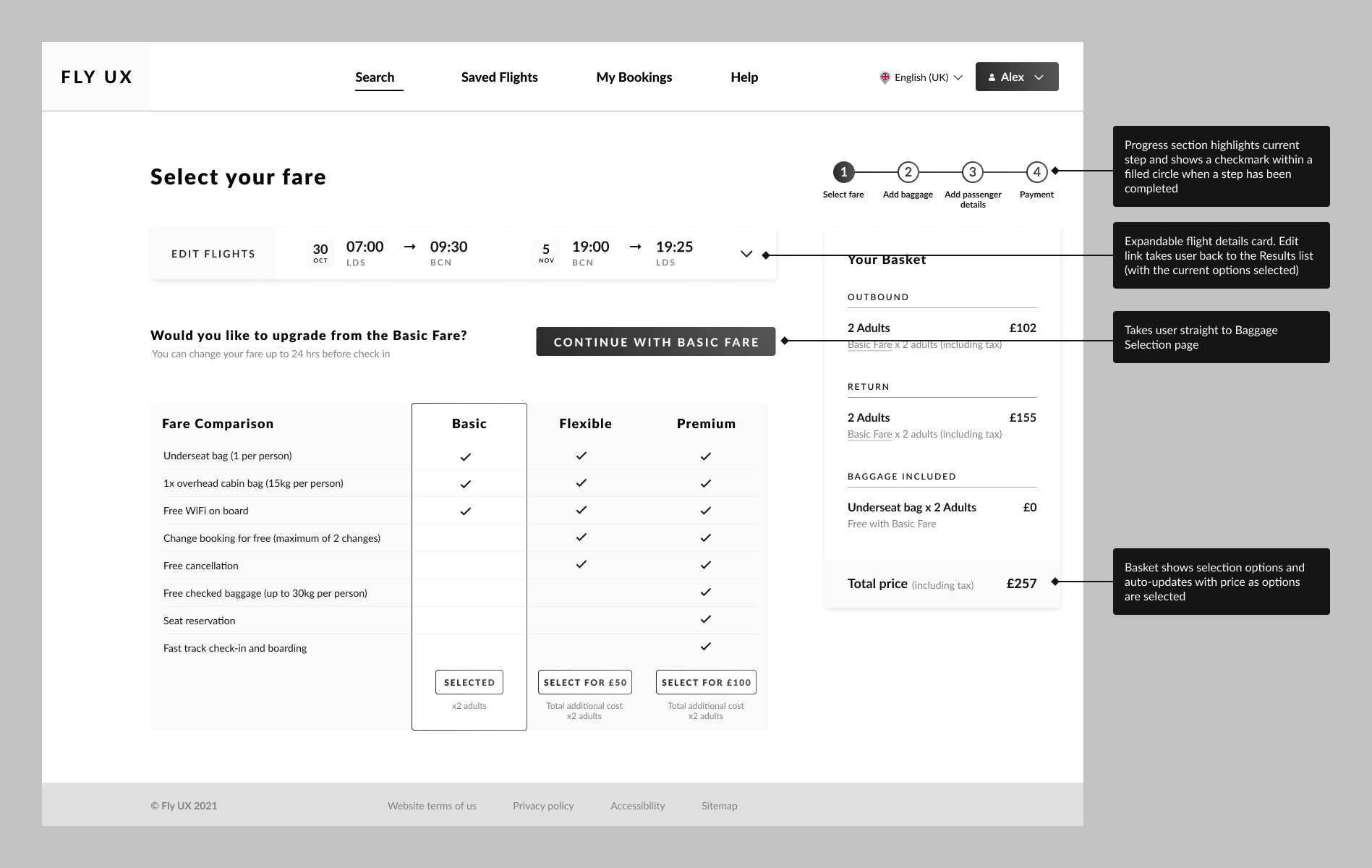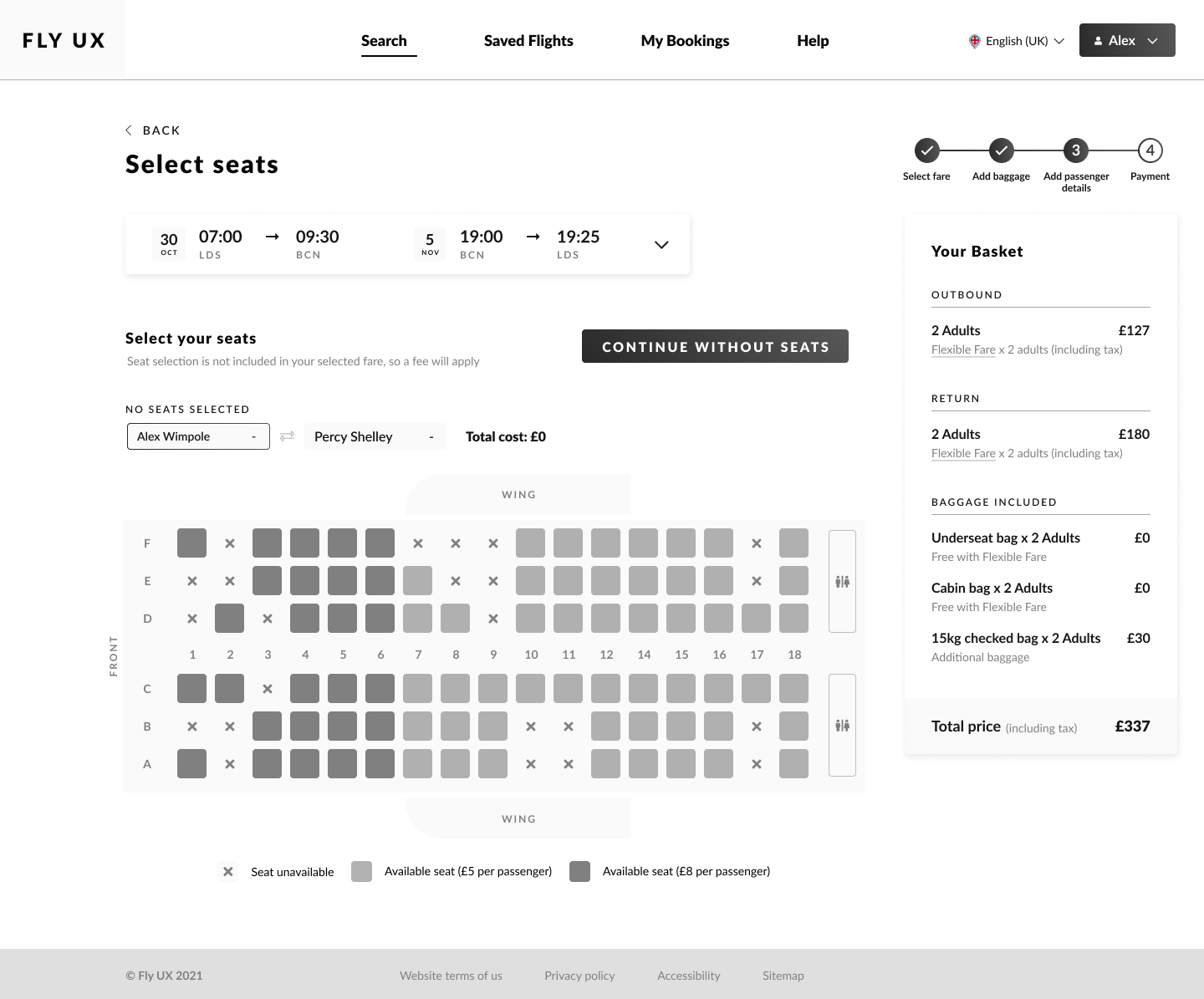 - Real-time price transparency: a persistent basket that updates immediately as users make selections. The total price is always visible and is broken down by category (flights, baggage, seats), so there are no surprises at checkout. Transparent pricing throughout lets users make informed decisions and feel in control.