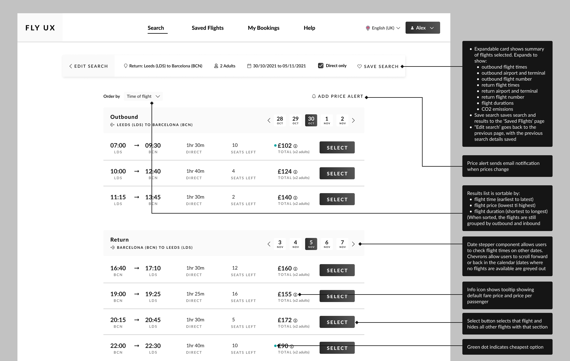 Flight booking is complex, potentially with multiple passengers, different fare types, add-ons, payment options etc. Good UX doesn't eliminate this complexity, but it presents information and options in a way that is predictable and digestible. A large part of the design challenge for this project involved ensuring the information was visible enough, with enough options to give the required flexibility, but without overwhelming the user. My research showed that users expect certain patterns in flight booking, and this can help with reducing cognitive load by leveraging familiar mental models.